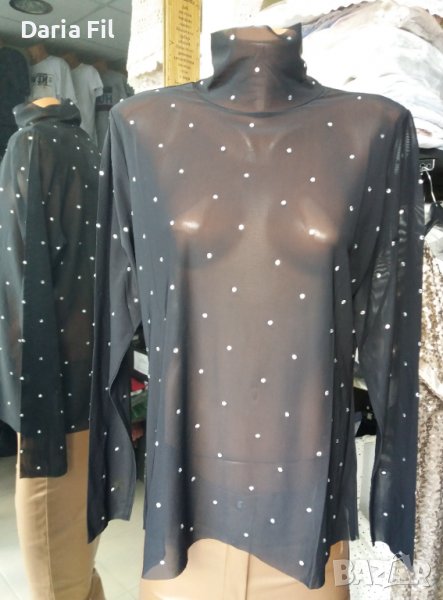УНИКАЛНА черна шифонена блуза с полуполо яка - цялата обсипана със сребристи камъчета → Обява 39390697