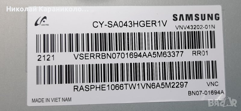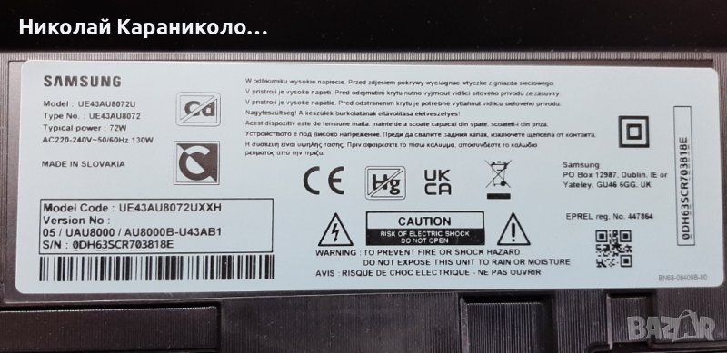 Продавам тв. SAMSUNG UE43AU8072U за части по причина-счупена матрица/CY-SA043HGER1V/.Редовни съответно: