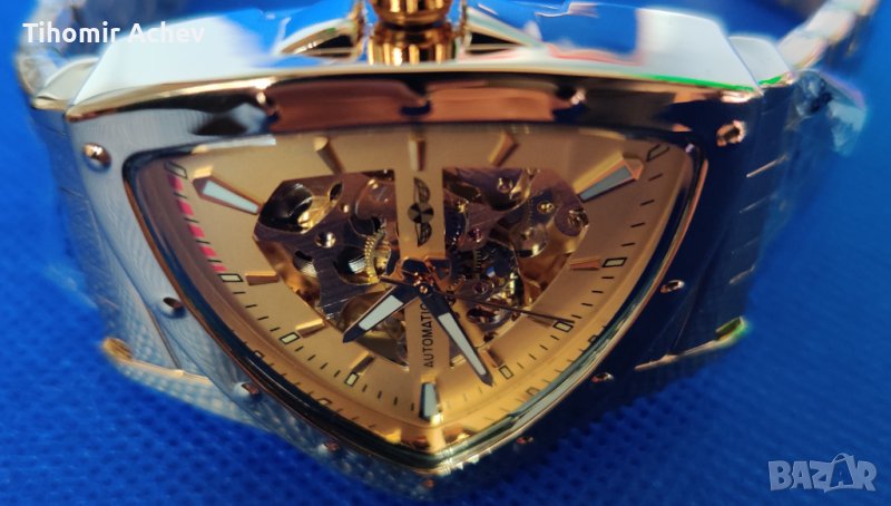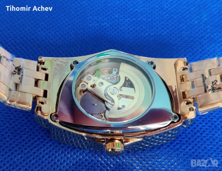 Позлатен ръчен часовник с автоматично навиване и нестандартна триъгълна форма, гаранционна карта.