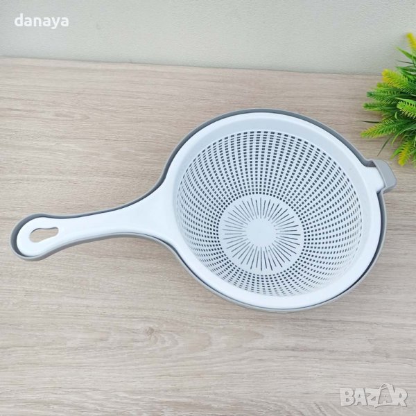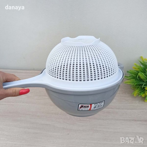 Голяма купа с вместимост 3 литра и дълга дръжка, заедно с гевгир. Подходящ за измиване и отцеждане на плодове, зеленчуци, паста и много други. Гевгирът е удобен за ползване, благодарение на дръжката. Двете части могат да се ползват както заедно, така и по отделно.