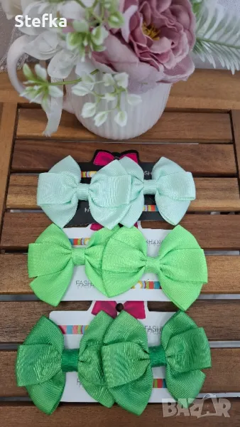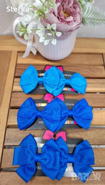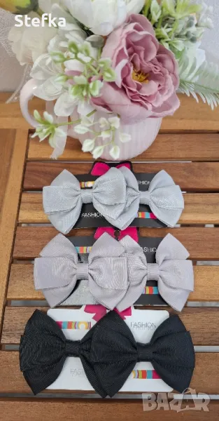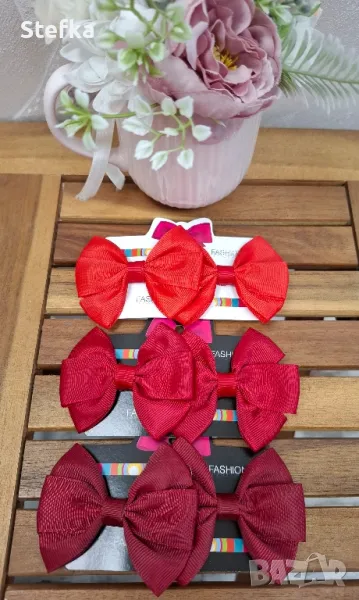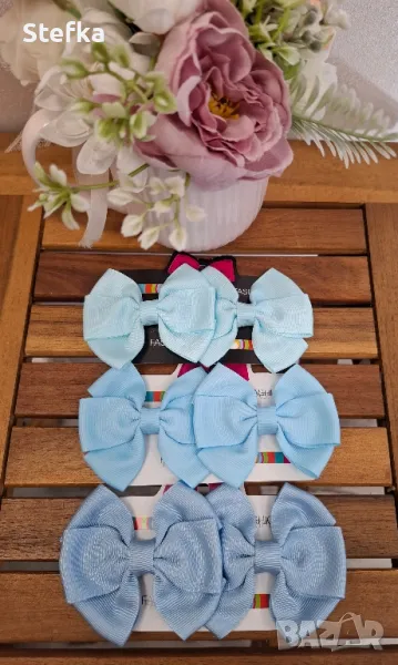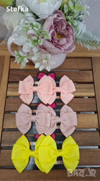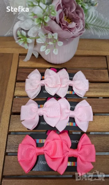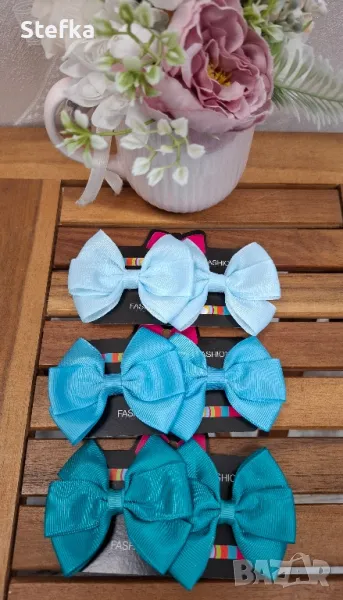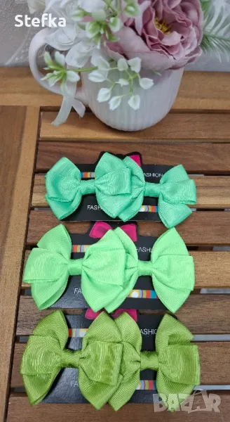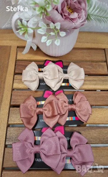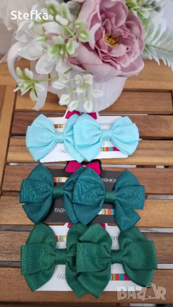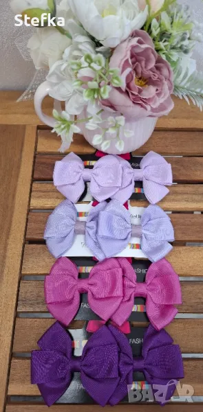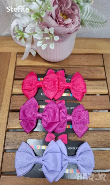 Ръчно декорирани фибички за коса тип щъркел - с голяма панделка 8см.. Прекрасно допълнение към тоалета на малките дами. При желание мога да се изработят и в други цветове. Цена за комплект от две фиби - 6лв.