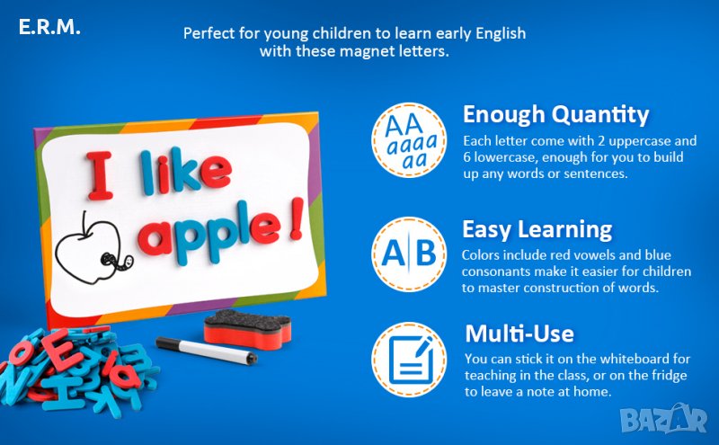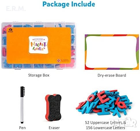 Компоненти на букви: 208 бр азбучни магнити от пяна в два цвята (червен и син), включва 52 главни букви, 156 малки букви, 2 въпросителни и удивителни знака, 1 двустранна магнитна дъска за писане (10,9 * 7,1 инча), 1 маркер и 1 гумичка. Кутията се предлага в размери 13,6 x 8,5 x 1,8 инча, тежи 31,6 oz.