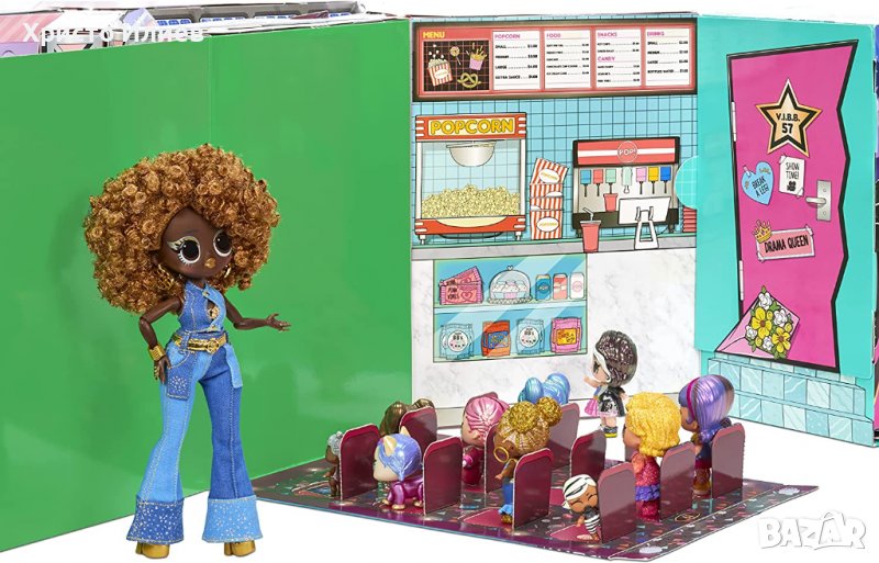 OMG Movie Magic Studio предлага готова за филм опаковка, която се превръща във филмово студио с 4 фона и кино зелен екран, както и статив за вашия мобилен телефон за заснемане! Пакетът включва 12 кукли за разопаковане, включително 2 модни кукли OMG, 6 кукли LOL Surprise, 2 домашни любимци и 2 Lil Sisters, така че можете да създадете пълен актьорски състав и екип за всеки от вашите филми!