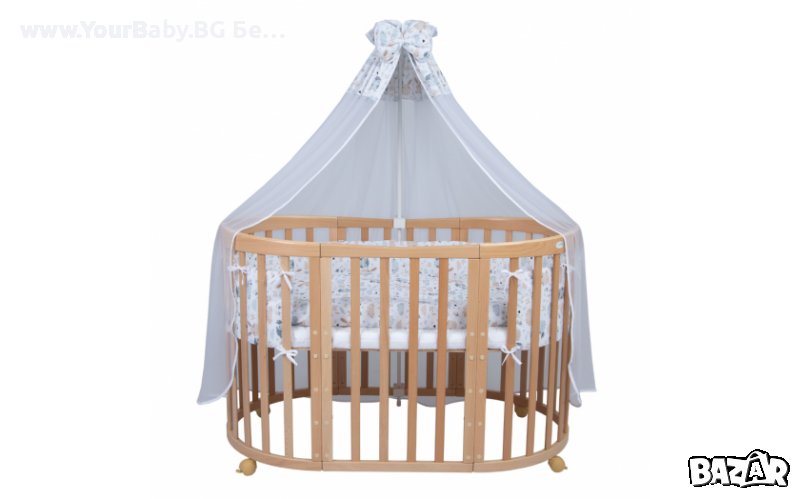 Нашата овална кошара 7в1 е плод на дългогодишен труд и опит. Изработена е от букова дървесина, която се отличава със здравина и същевременно лекота. Тази мебел за деца ще се превърне в основна украса на интериора и функционално оборудване. Ще осигури на вашето мъниче спокоен и безопасен сън.