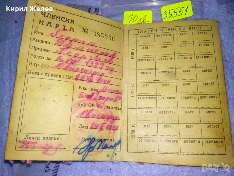 СЪЮЗ на НАРОДНАТА МЛАДЕЖ в БЪЛГАРИЯ ЧЛЕНСКА КАРТА СТАР НРБ СОЦ ДОКУМЕНТ РЯДЪК за КОЛЕКЦИЯ 35551
