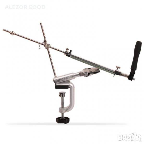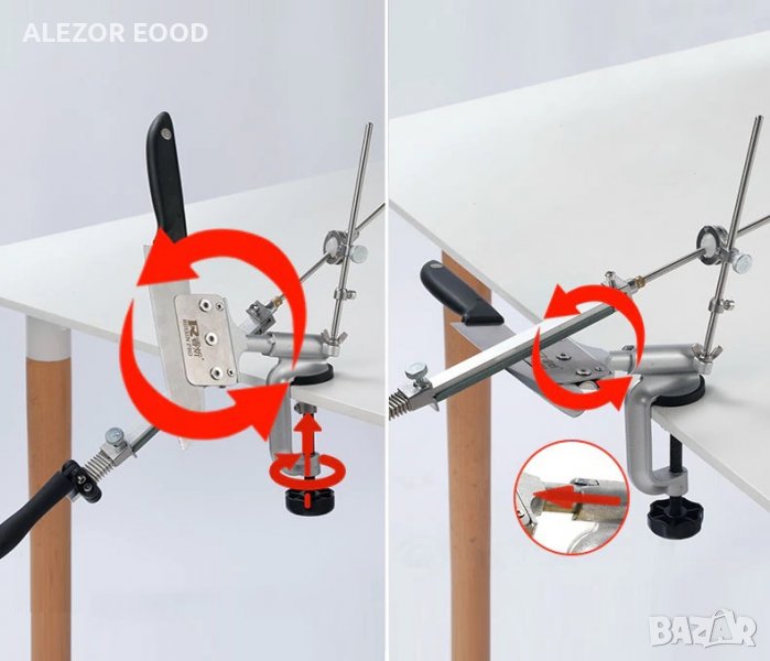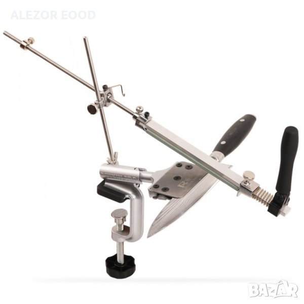 Професионално точило със захващане тип стяга (менгеме) за плот. Чрез системата за завъртане на шипката фиксираща острието не се налага да освобождавате ножа за да обърнете другата страна за заточване. Необходимо е само да издърпате щипката и да я завъртите в желаната посока. По този начин можете да изберете вертикална или хоризонтална позиция за заточване на острието или да го завъртите на 360 градуса. Ъгълът на абразива спрямо острието на ножа може да варира от 5 до 90 градуса. Конструкцията е изцяло стоманена, устойчива на всекидневни натоварвания. Чрез тази система за заточване под фиксиран ъгъл може да се заточва остриета на ножове, ножици, дърводелски длета, ножове на дърводелско ренде, бръсначи и други режещи пособия.