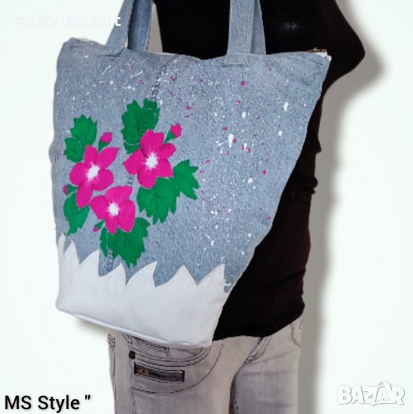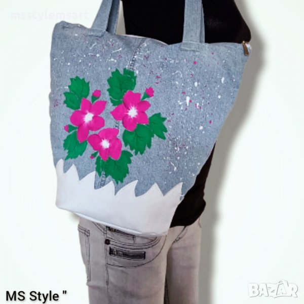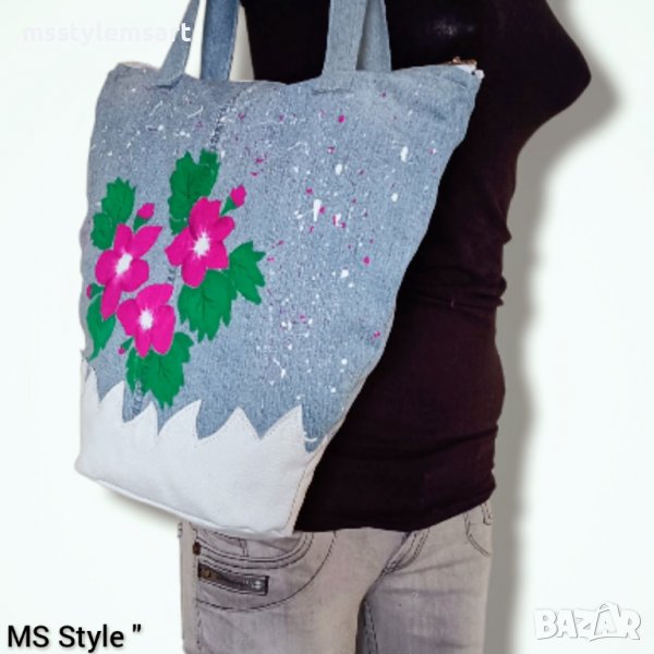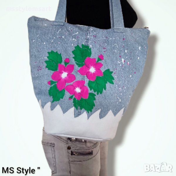 Чантата е #ръчно #изработена от #деним с #декорация и #дъно от #естествена #кожа, #ръчно #рисувана с #текстилни #бои, с #едно #отделение, закопчава се с #цип, #памучна #подплата и голям #вътрешен #джоб.