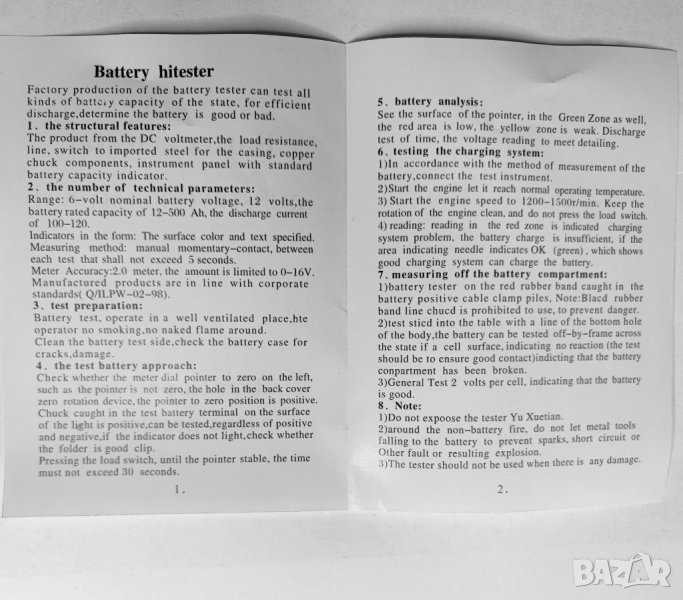 1.Щипките се защипват за клемите на акумулатора, включва се копчето и на десетата секунда се отчита показанието на уреда.