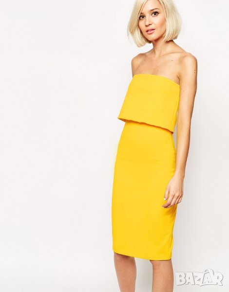 Lavish Alice жълта рокля в миди дължина без презрамки. Със силиконови ленти на бюстието.