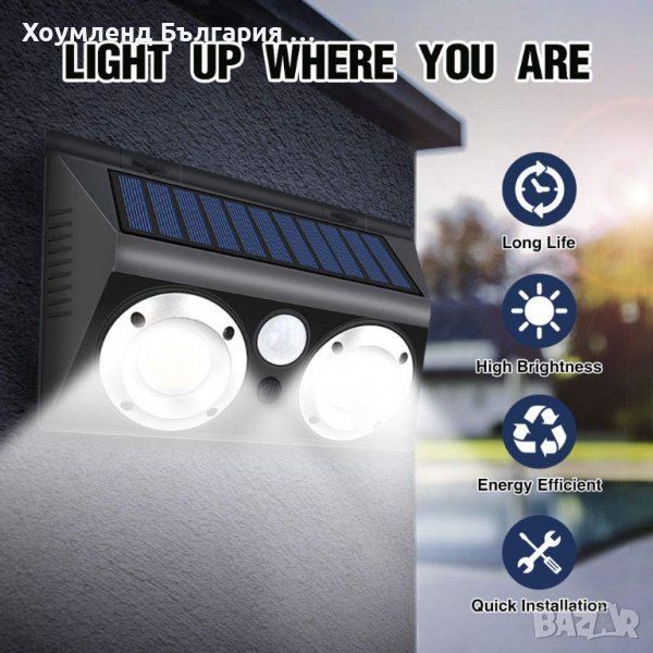 Ярка соларна лампа с двойни лупи и сензор за движение.