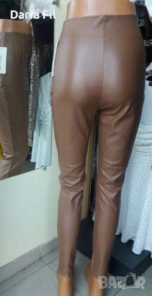 Бежов еластичен панталон с висока талия с ефект на кожен → Обява 39425786