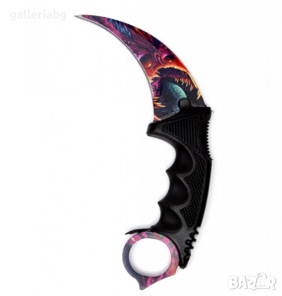 нож с дръжка и калъф и метално цветно острие с рисунка.