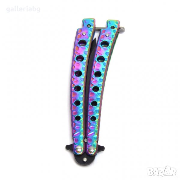 Джобен нож тип пеперуда с черно острие и дръжка цвят хамелеон.