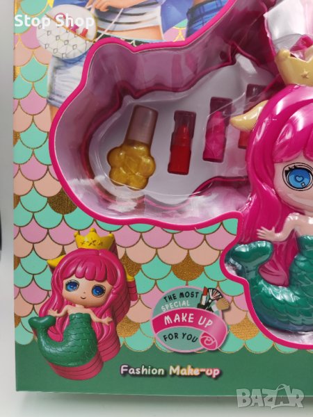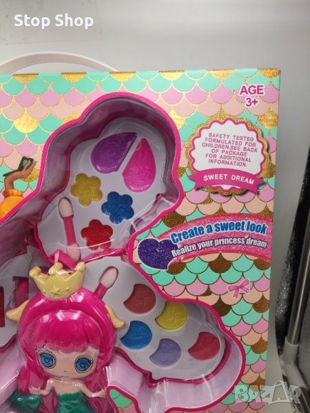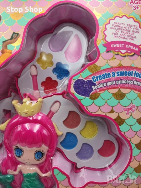 Впечатляваща палитра за разкрасяване под формата на симпатична русалка, която няма да остави равнодушно нито едно момиченце! Кутийката е на три нива и е с плъзгащ се механизъм, като всяко ниво съдържа различен вид макиаж: етаж 1: прахообразни сенки в нежни цветове; етаж 2: прозрачен гланц; етаж 3: лак на водна основа и 3 цвята червило. Комплектът е перфектния подарък за начинаещи гримьорки, който ще грабне вниманието на вашата принцеса и ще го задържи задълго!