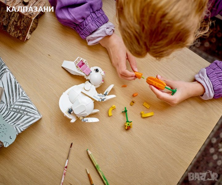 Децата на възраст над 8 години могат да разиграват забавни истории с фантастичния комплект за игра LEGO® Creator Бял заек „3 в 1“ (31133). Включва зайче от тухлички с подвижна глава, крака, уста и уши и се предлага с избор от 2 неща за хапване: морков или цвете. Непрекъсната игра с въображение за любителите на животни В комплекта LEGO Creator „3 в 1“ има 3 различни модела за построяване и игра, с които децата да се забавляват. Те могат да построят зайче и след това да го превърнат в красив папагал какаду, който яде семена, или очарователен бял тюлен, който си похапва риба. Забавна дигитална среда за феновете на LEGO Реалистичният процес на конструиране с напътствия благодарение на приложението LEGO Builder за мащабиране, завъртане и визуализиране на модела помага на по-малките строители да вдъхнат живот на творението си на своя таблет или смартфон и им дава удовлетворяващо усещане за постигнатото.