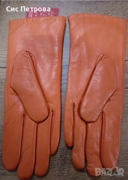 Дамски ръкавици от естестена кожа, цвят оранж, българско производство. Никога не са носени, с етикет. Размер 8 по тяхната номерация, според мен са подходящи за S размер, не много голяма ръка.