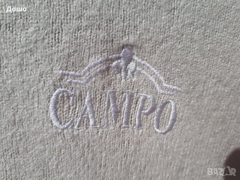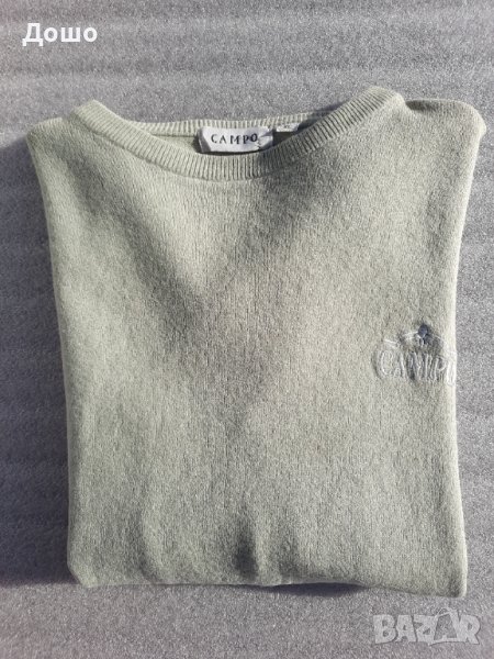 Пуловер 100% вълна Campo размер XL. Гръдна обиколка едностранно 61 см., дължина 62 см., рамо 20 см., ръкав 55 см. Бледо зелен, много мек, без забележки.