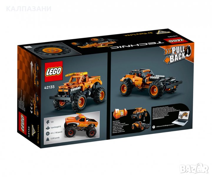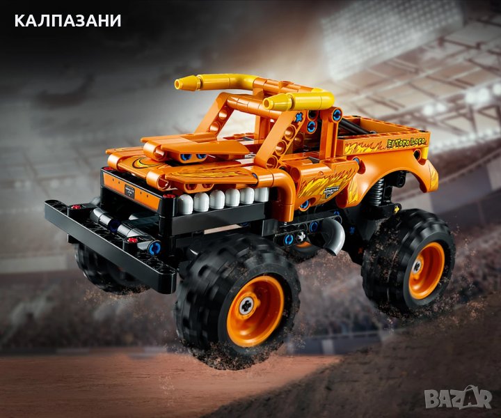 Един от най-емблематичните камиони Monster Jam™, El Toro Loco™ (42135) винаги осигурява интригуващи характеристики. Сега децата на възраст 7 и повече години могат да възпроизведат любимия си камион чудовище във формат LEGO® с тази пълна с енергия играчка за сглобяване. Феновете на популярния камион ще харесат оформлението на клаксоните, пръстена на носа, зъбите и огнените графики – точно като на истинския. Децата могат да дърпат назад камиона, за да го изпратят в надпревара напред, или да построят собствени рампи, за да отиграват хитри трикове. Играчка „2 в 1“ за повече часове забавление Има много за откриване в този комплект за сглобяване. Когато децата поискат ново предизвикателство, могат да превърнат камиона чудовище в каменна състезателна кола, задвижвана с дърпане назад. Този всъдеходен автомобил се отличава и с автентична предпазна клетка в кабината. Вдъхновение за механиците на утрешния ден С превозни средства, изглеждащи и функциониращи като оригинала, моделите за конструиране LEGO Technic гарантират увлекателно въведение в конструирането и механиката за младите фенове на LEGO.