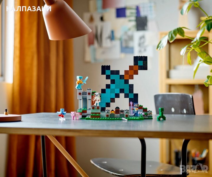 Подарете на някой Minecraft® майстор над 8 години – диамантен меч в гигантски мащаб! LEGO® Minecraft Базата на меча (21244) използва безценното оръжие като вдъхновение за страхотна база, където децата могат да създадат зона на спокойствие, но и да участват в експлозивни битки. Играйте с модела на диамантения меч и го изложете на показ Децата изграждат огромна база с форма на диамантен меч в планината и я защитават от нападенията на враждебни мобове. Базата съдържа маса, курабийка и джукбокс, на който може да се „пускат“ плочи. Навън фигурките на войник на пост и воин пазител следят за опасности. Има и допълнителна огнева мощ, която се осигурява от две оръдия в предната част на базата. Враждебните мобове включват Creeper™ и скелет. Добронамерените мобове са прасе и алай с крила от фолио. Ръчката в основата на кулата задейства експлозия, която срива част от структурата. За допълнителни цифрови забавления в приложението LEGO® Builder има интуитивни инструменти за мащабиране и ротация, с които децата могат да визуализират модела по време на изграждането.