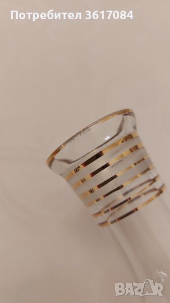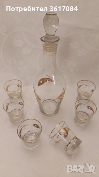 Стъклен антикварен сервиз от 30-те години на миналия век в стил Арт Деко. Може да се смята и за антика. Комплектът е пълен, състои се от гарафа и шест чаши за ракия, коняк или ликьор. Украсата му е фина и същевременно ефектна, от златни флорални елементи и кантове, както и ръчна гравюра. Много запазен е за годините си, няма никакви наранявания, само на две места позлатата е поизтъркана, около гърлото на гарафата и на една чашка, показано на последните две снимки.
