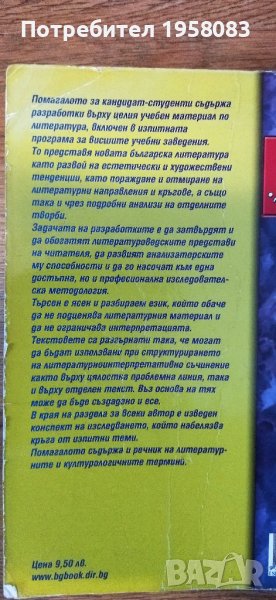 Помагалото за кандидат-студенти съдържа разработки върху целия учебен материал по литература, включен в изпитната програма за Висшите учебни заведения. То представя новата българска литература като развой на естетически и художествени тенденции, като пораждане и отмиране на литературни направления и кръгове, а също така и чрез подробни анализи на отделните творби.