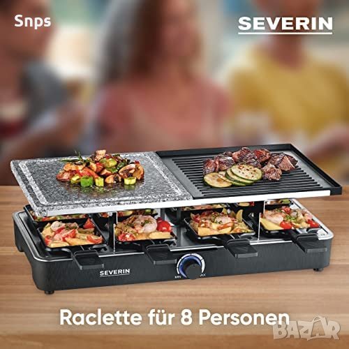 Детайли – Скара за раклет Северин с 8 съда за раклет, естествен скара камък и набраздена плоча с незалепващо покритие, макс. 1300 W мощност