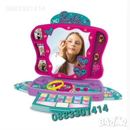 Комплет Barbie гримове с огледало, за да се превърне Вашето момиченце в истинска принцеса. С това собствено студио за красота детето разполага с 11 цвята сенки в атрактивни цветове, 11 цвята гланц за устни, 2 апликатора и една гъбичка.