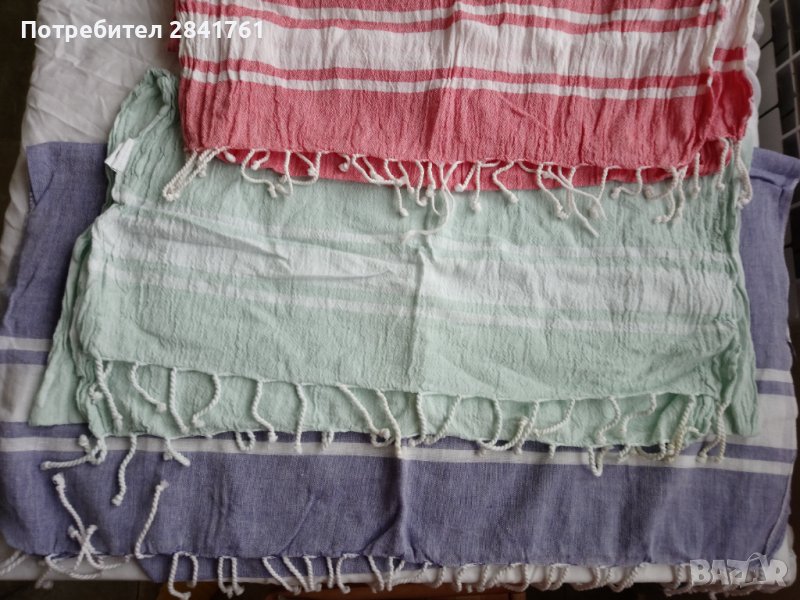 Фин памучен шал с ресни. Червеният и светлосиният са от кенарен плат. Всеки на цена от 7€ Ако се вземат и трите са на обща цена от 18€