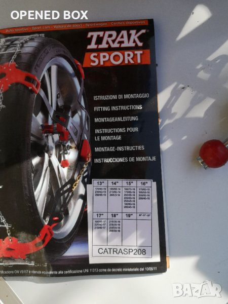 Вериги за сняг, подходящи за всякакъв тип автомобили, включително и такива, които не приемат традиционни вериги поради намаленото пространство между гумите и вътрешните части на колелото. Особено подходящ за спортни автомобили или с ниско окачване благодарение на минималния размер на протектора (само 10 mm). УНИВЕРСАЛЕН: монтажът се извършва само от външната страна на гумите, без да се засягат вътрешните механични части на колелото; Поради това веригите Trak са подходящи и за автомобили, определени от производителите на автомобили като такива, които не могат да бъдат свързани с вериги. ЛЕСНО ЗА СГЛОБЯВАНЕ: просто поставете веригата върху едната част на гумата; възползвайки се от напредването на колата, Trak се качва на волана сама, без да бъде докосвана. Освен това, фиксирането се извършва само върху външната част на задвижващите колела, поради което не са необходими трудни операции за закрепване на веригата върху вътрешната част на колелото. МАКСИМАЛНО ПРИЛЕПЯНЕ: Trak се настройва сам; това позволява перфектно прилепване на веригата към протектора на гумата, което води до безопасно и безшумно шофиране. УЛТРА ЗДРАВИ: връзки от високолегирана стомана с полукръгло сечение с диаметър 3 mm, със запокриващи се заварени, цементирани и електролитно поцинковани усилващи връзки; закалени и поцинковани стоманени напречни елементи с нови армировъчни пръти от високолегирана стомана с намалено сечение и нови самонатягащи се гумени обтегачи. СЪВМЕСТИМО С НАСТОЯЩИТЕ СТАНДАРТИ: Веригите TRAK са сертифицирани по TUV, CUNA NC 178-01 и L 200. Подходящи за следните размери гуми: