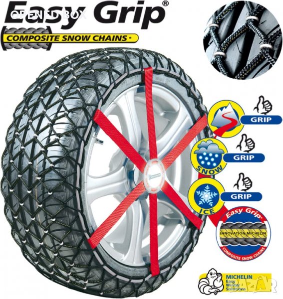 Michelin Easy Grip е еластичен чорап за сняг без кукички, който лесно се разпъва около колелото. Приложението завършва с издърпване на мрежата, за да се разтегне около колелото (трябва да карате леко напред, за да можете да издърпате Easy Grip върху цялото колело), след което завършвате процеса, като закрепвате мрежата с колана. Michelin Easy Grip е одобрен за използване върху покрити със сняг и лед пътища съгласно ÖNORM V 5121. Michelin Easy Grip може да се използва при автомобили с предно и задно задвижване (също и задвижване на четирите колела) и е съвместим с ABS, ESP, ASR и други системи за сигурност. Неговото ниско тегло и гъвкава форма означават, че винаги ще има място в багажното отделение, където тези вериги могат да се поберат. Предимствата на Easy Grip за купувачите включват бързия и лесен процес на инсталиране, атрактивна цена и отлично представяне на сняг. На лед веригата се представя повече от адекватно.