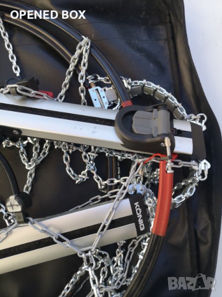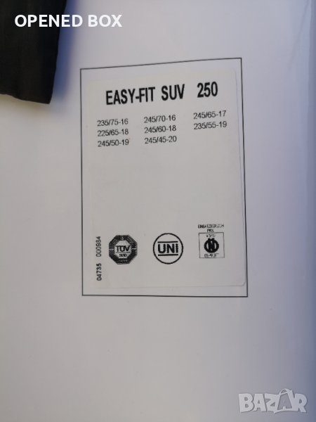 Който иска най-добрата верига с най-голяма лекота на използване, не трябва да търси повече от König Easy-fit SUV. Тази изключително модерна и усъвършенствана верига за сняг съчетава лекота на използване и отлично представяне на заснежени и заледени пътища. Поставянето на верига не може да бъде по-лесно, благодарение на патентованата система за опъване. Може да се закачи на колелото с едно движение на крака и да се откачи чрез натискане на двата червени бутона отпред. След това веригата може да се постави в предоставената чанта, така че багажникът на колата ви да не е пълен с мръсотия. Колелата са защитени с найлонови скоби. Те осигуряват разстояние между веригата и джантата, така че възможността за повреда е елиминирана. Звената на веригата са само 10 mm, което прави веригата много по-тиха от другите вериги. За да се осигури оптимално сцепление, има подсилвания на ледената покривка за подобряване на сцеплението, когато сте на лед. В допълнение, веригата на шарката е асиметрична, за да се спечели повече повърхност на земята. Накратко, верига, която може да се справи и в най-взискателните условия. Тази верига за сняг е с размер: Ö-Norm 5117, UNI 11 313 и TÜV.
