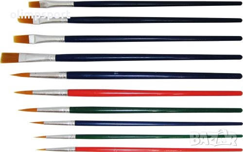 Четки за рисуване 10 броя (6 обли и 4 плоски) от синтетичен косъм. Различни дължини на четките. Подходящи за употреба у дома, в училища и детски градини. Дължини обли четки - от 18.5 до 21 см. Дължини плоски четки - от 18.5 до 19 см. Размери опаковка - 32х12х0.5 см. Тегло за комплект - 50 г. Кръгло тяло. Цвят четки - различни цветове.