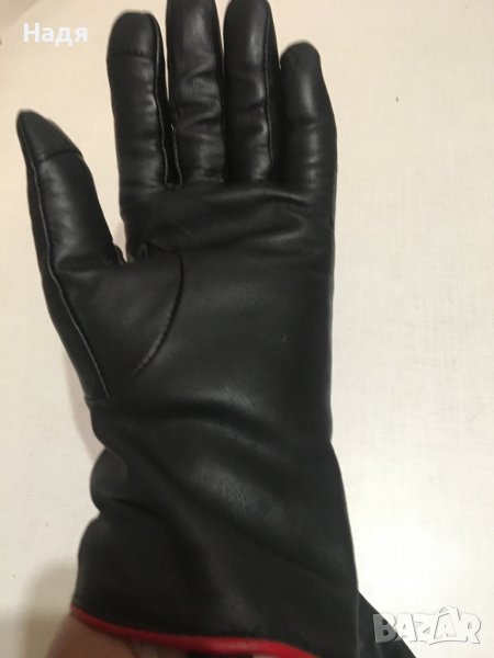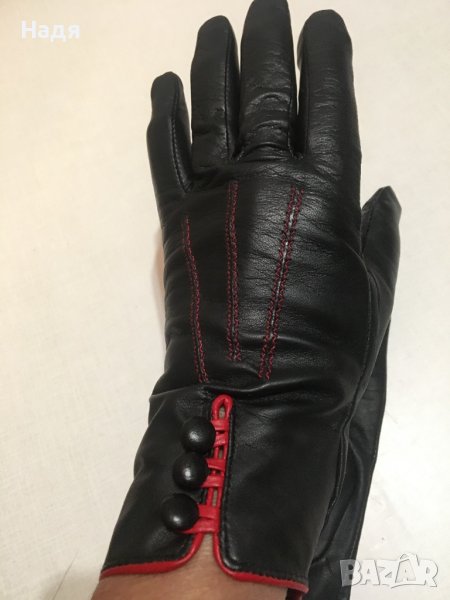 Ръкавиците са много елегантни,естествена,мека кожа- черна .Има декорация от червени закопчалки на 3 копчета и червени декоративни шевове.Закупени са от Щатите.