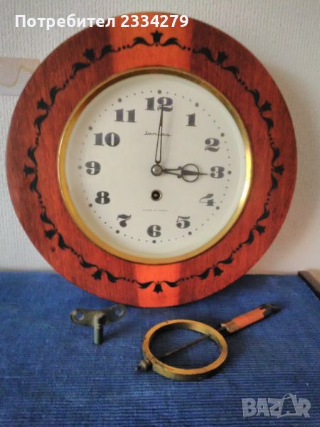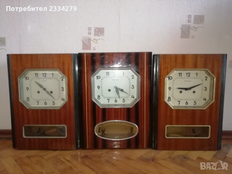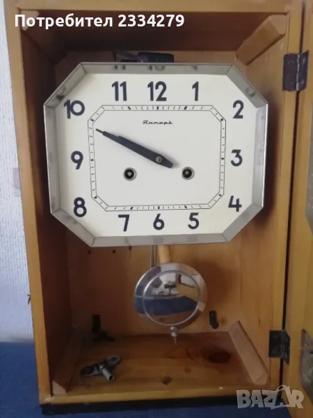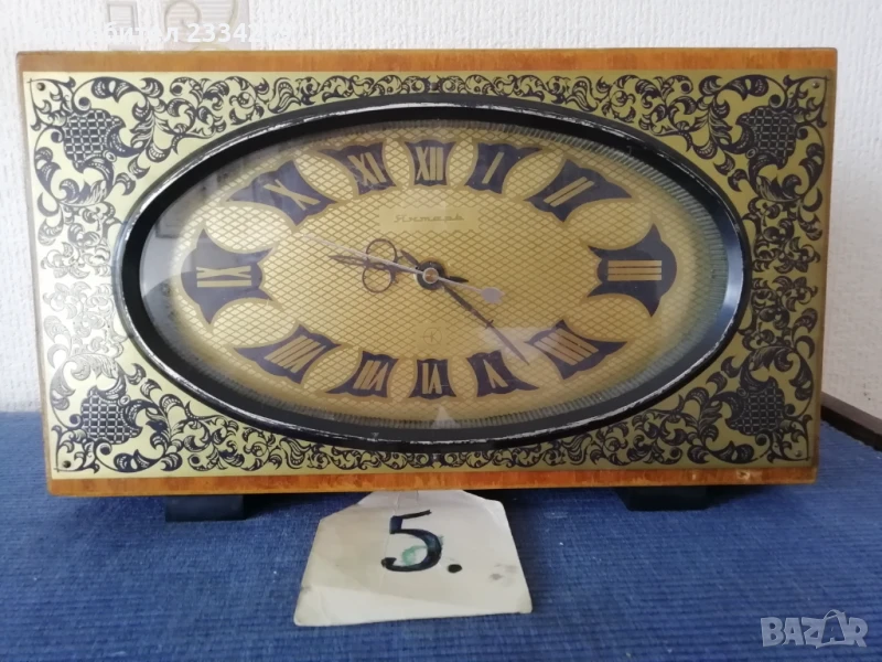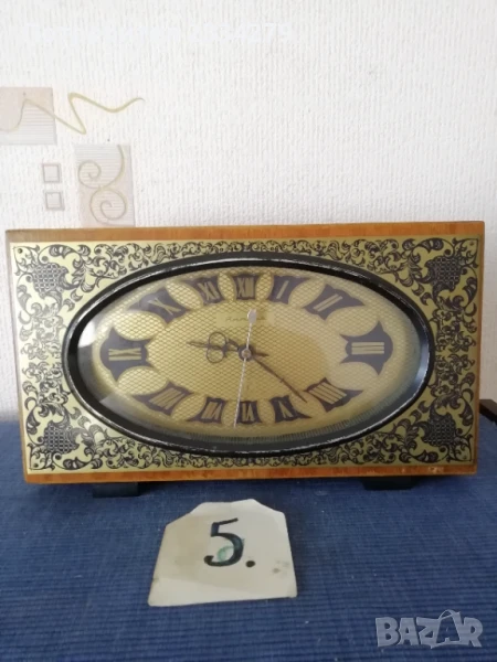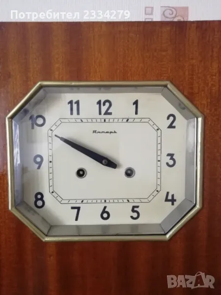 стенен часовник. ,,Jantar" made in USSR. с гонг, правоъгълен от дърво,стъкло и метал ,запазен цена 85лв.; N:3 стенен часовник,,Янтарь" сделано в СССР, правоъгълен, работещ точно има и гонг на всеки кръгал и половин час в, много добро състояние, комплектен с махало и ключ, цена 70лв.; N:4 стенен часовник, механичен с ключ, рядко срещан единични изработки юбилейни за олимпиадата в Москва-80, има и емблемата на олимпиадата, 70лв.; N:4 стар настолен ретро часовник електромеханичен от 70-те години бароков стил, електромеханичен, работещ, цена 25лв.; N:5 стар настолен часовник ,,Янтарь" сделано в СССР 1975г., флоренциански стил, електромеханика, цена 25лв.; N:6 стар каминен часовник от 50-60те години, механичен с ключе и красив мелодичен гонг, точно работещ, цена 70лв.