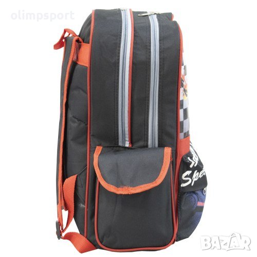 Ученическа раница SPEED CLUB, 44х34x21 см. Разполага с две основни отделения с цип, два странични джоба, един лицев джоб с цип и удобни презрамки. Материал - полиестер с PVC промазка. Раниците са с пришит накриво хастар между двете основни отделения. Без забележки по външния вид.