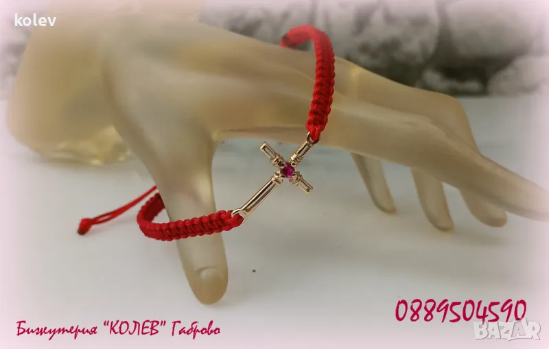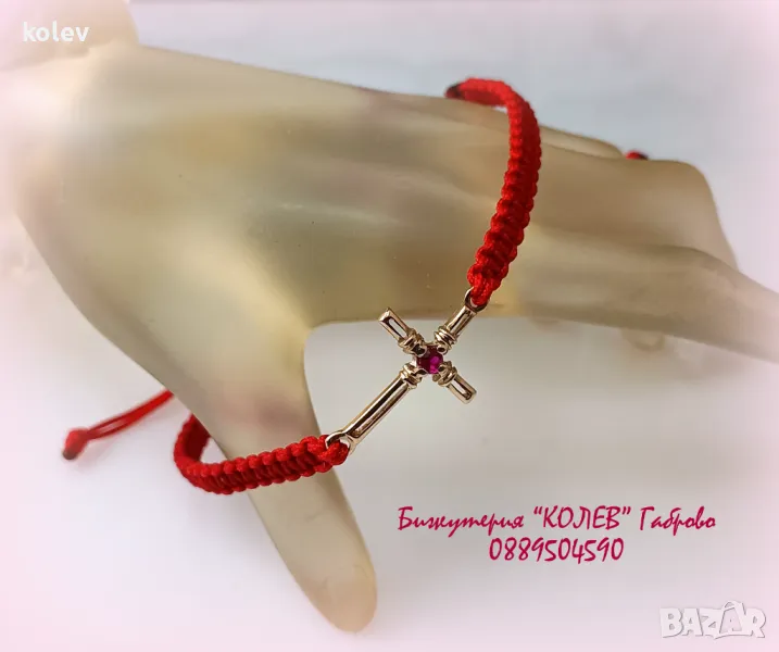 златен кръст с рубин в гривна червен конец, за здраве и късмет