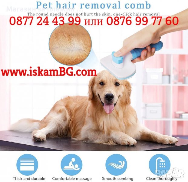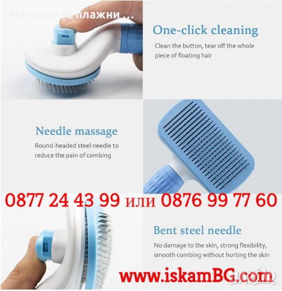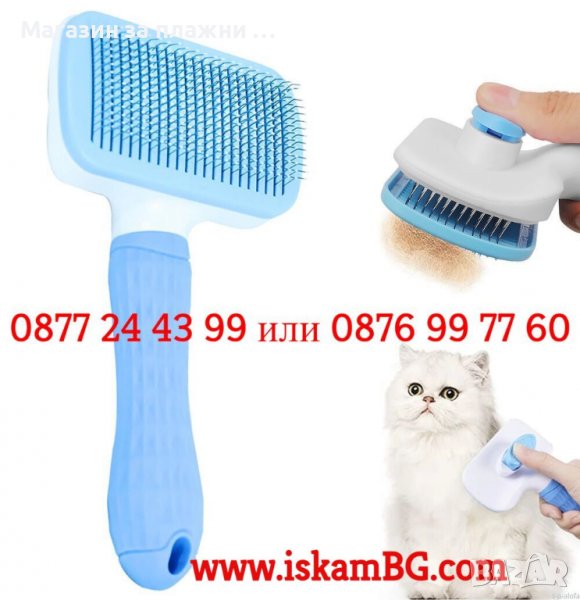 Четка за почистване и грижа за козината на кучета и котки, със самопочистващ се бутон, 19x10.5x6 см, Синя, Розова или Сива