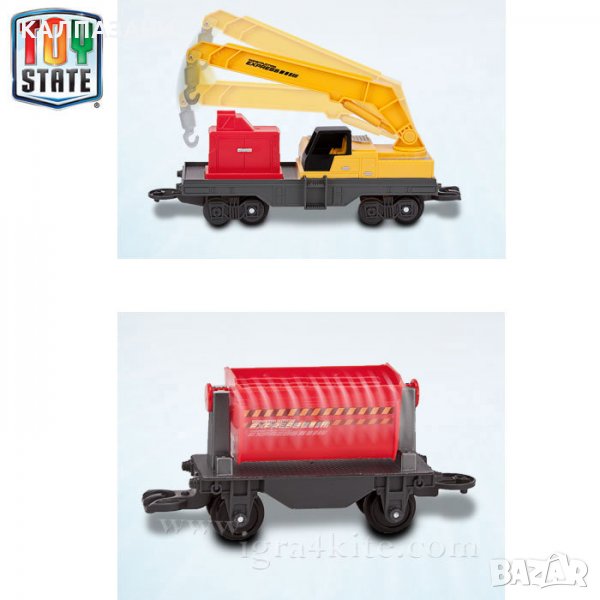 Играта с тази огромна влакова композиция е много забавна. Комплектът включва релси, голям локомотив, 4 вагона, платформа с 2 строителни машини.. Влакът се активира и спира чрез натискане на бутона, има и светлинни ефекти. Размер на трасето: 157,5 х 104 cm Работи с 3 C батерии Играчка за деца над 3 години