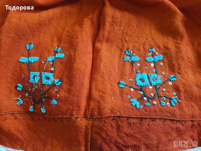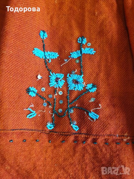 Автентична престилка от народна носия.Дължина- 70 см.Вълнена с мъниста и лутурки.Забележки-няколко протрити места и дупка-видна от снимката.