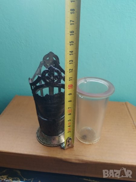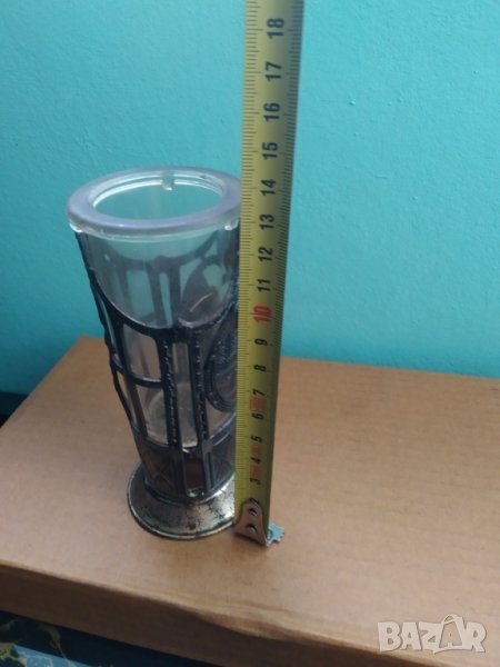 съд,поставка за клечки арт деко.стъкло с метален обков,забележка-отвор на дъното на стъкленицата.