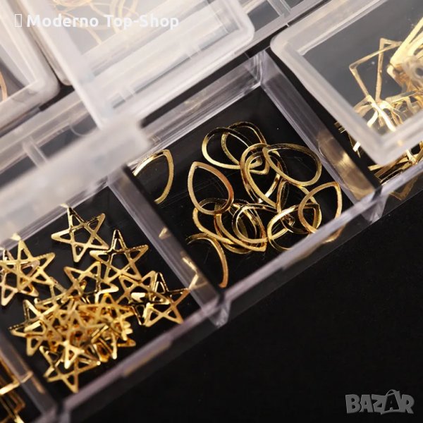 Органайзер със златисти метални елементи за декорация на нокти.