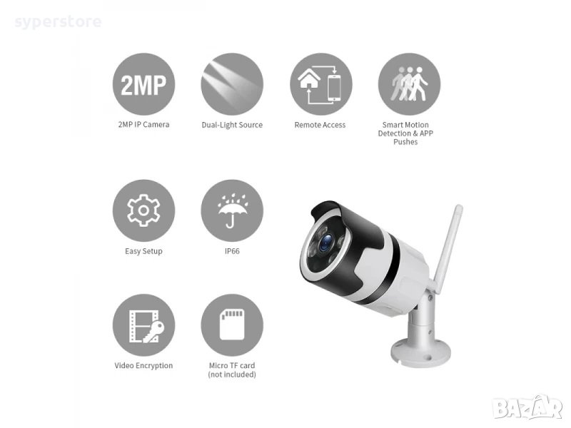 Wifi камерата може да се настрои и монтира за няколко минути, без необходимост от допълнителни устройства или кабели. Камерата изпраща нотификации при движение или звук директно на смартфома, чрез приложението с което работи. Автоматичен нощен режим. Наблюдение през мобилни устройства: Android, iOS