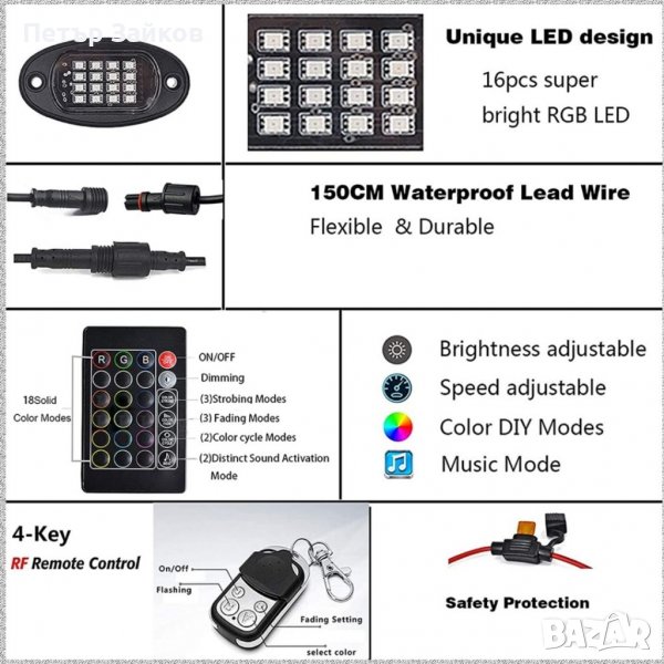FR/IR безжично дистанционно управление: RF управление с 4 клавиша: Този комплект позволява на скалната светлина да има различни шарки, да мига, да избледнява или да запазва плътен цвят. IR 24 бутон за управление: Има четири цветови корекции, които са цветен стробоскоп, избледняване на цвета, цветови цикъл и музикален ритъм, всички от които могат да достигнат скорост от ниво 10; 1 регулируем режим на яркост на светлината.