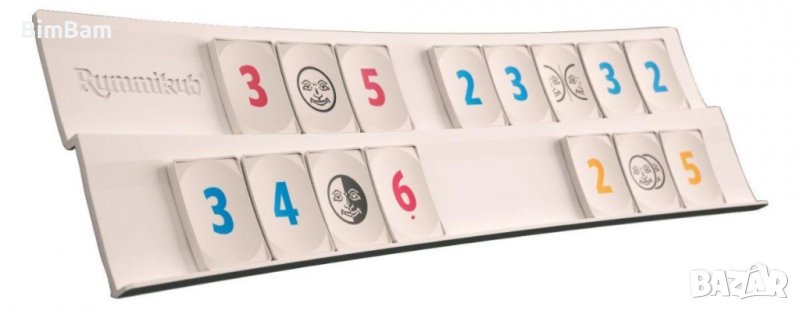 112 плочки с числата от 1 до 13 (по 2 комплекта в черно, оранжево, синьо и червено), 8 плочки джокер, 4 поставки и 8 крачета за поставките.