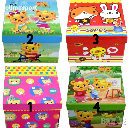 Рисувателен комплект 58 части. Комплектът представлява кубче с чекмеджета. Съдържа всички необходими пособия за малките творци - гума, острилка, обла четка, кламер, 12 цвята водни бои, 6 цвята флумастери, 10 къси цветни моливи, 10 пастели и малки картинки за оцветяване. Размери - 14х14х10 см. Тегло - 400 г. Различни модели.
