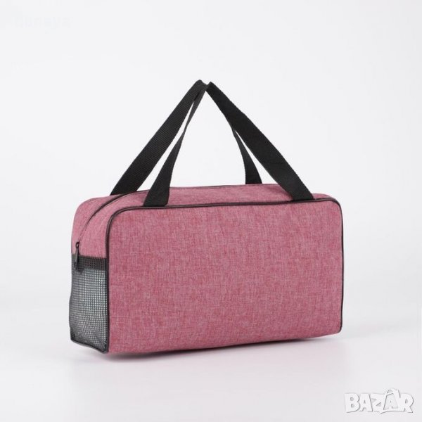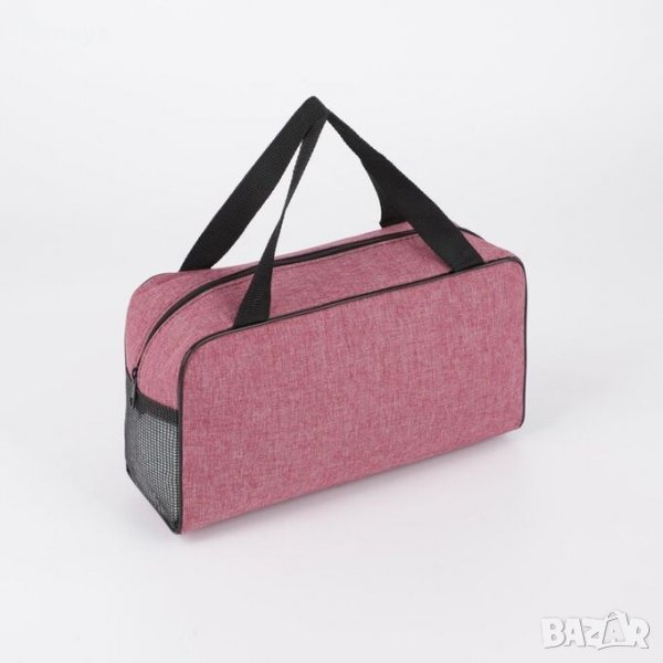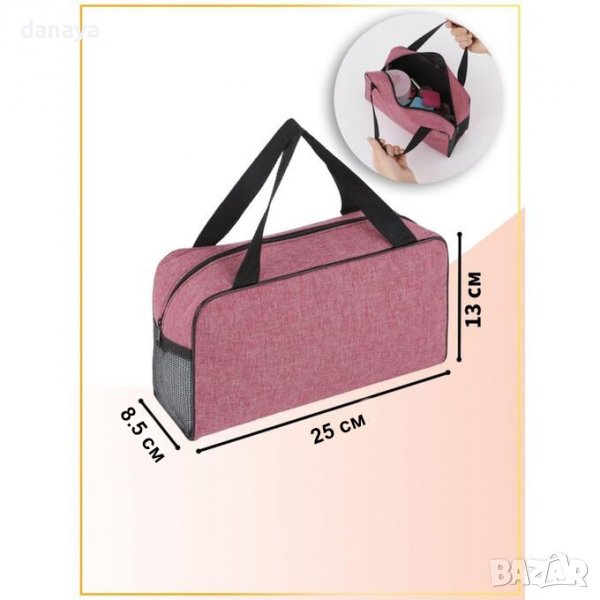 Текстилна козметична чантичка с черни дръжки, в изчистен дизайн. Може да се използва като несесер за гримове, козметика, тоалетни принадлежности. Козметичен несесер, удобен при пътуване. Чудесен органайзер, с който нещата ви ще са винаги прибрани и под ръка.