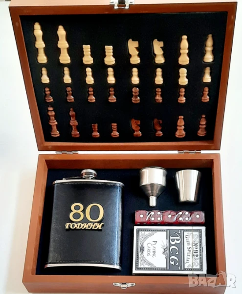 - Юбилейна бутилка декорирана с кожа със съответните, златни, релефни цифри и дървена плочка с пожелание.
