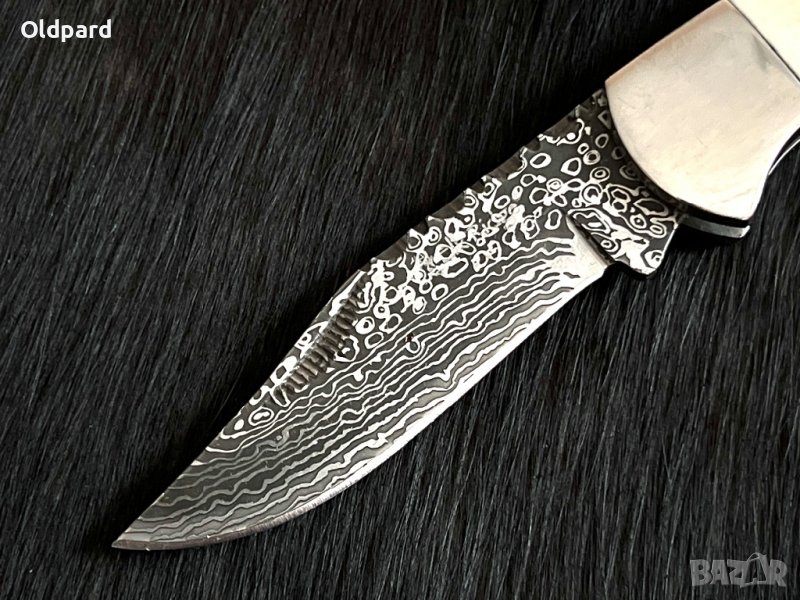 Ножът има много красиво острие в стил гравиран модел на дамаск. Дръжката е кост. Кутия. Дължина на острието 7,3 см. Дължина на сгънат нож 9,5 см. Това е прекрасен подарък за мъж за всякакви празнични поводи.