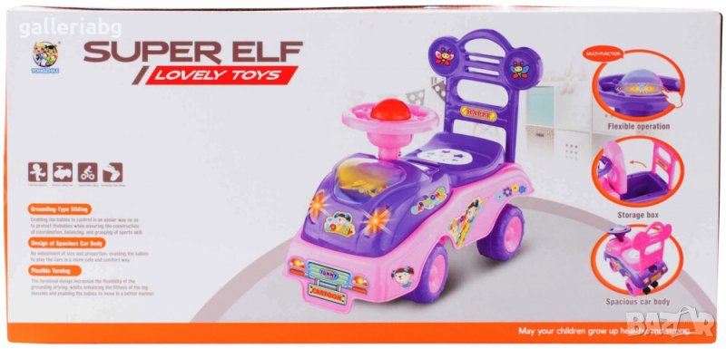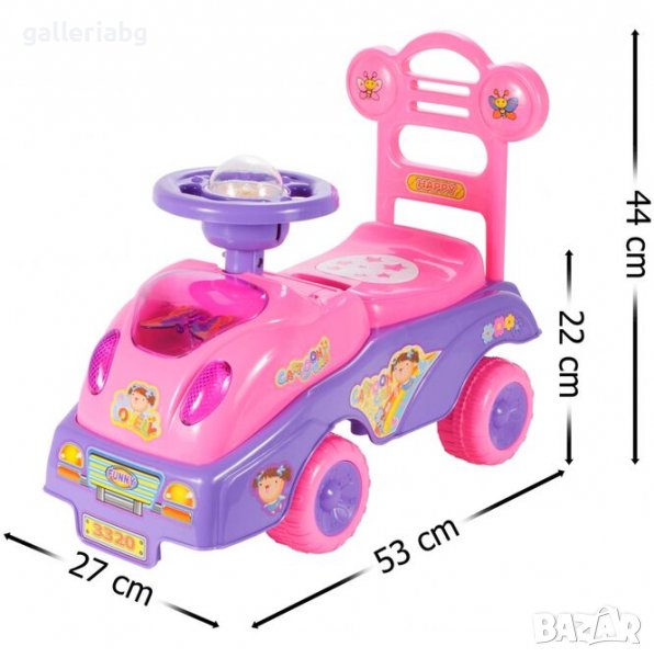 Кола за каране, която осигурява страхотно забавление на детето. Оборудванa е с отделение за съхранение под седалката, клаксон във волана и удобна седалка с подвижна облегалка. Освен това, след поставяне на батерията, ride-on възпроизвежда 17 различни мелодии.