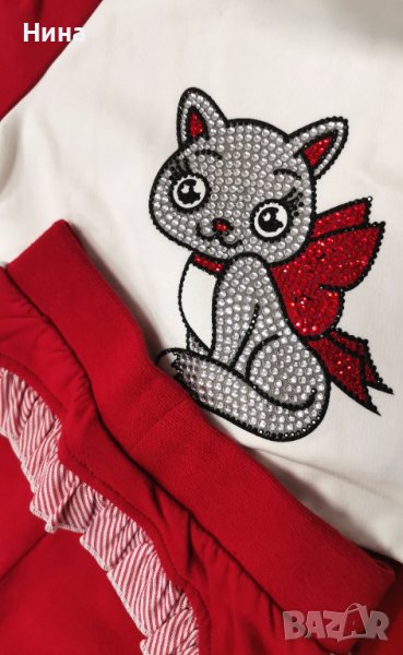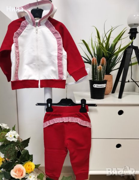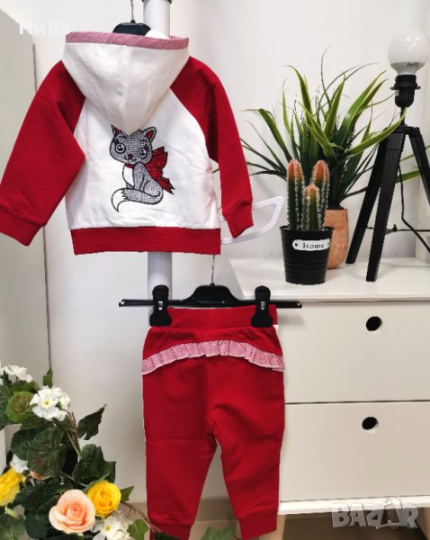 Ох... Много го харесвам ❤️ Супер сладък комплект от 2 части - горнище с цип и качулка, с прелестни харбали и апликация от бляскави камъни на гърба ✨ и долнище с харбали с бяло и червено 🔝 Размери: 9 месеца и 12 месеца 🛍️ За още моделчета разгледайте и останалите обяви в профила ми.